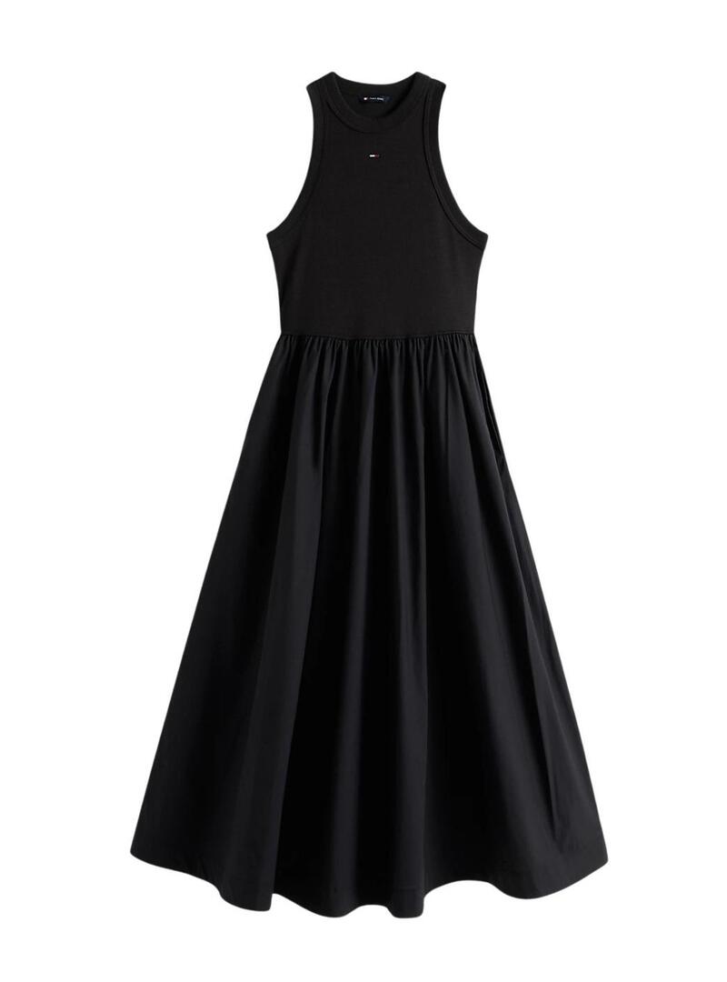 Vestido Tommy Jeans. Modelo Poplin. Cor preta. Sem mangas. Decote halter. Comprimento midi até os tornozelos. Corte em linha A. Saia com volume. Corpo ajustado. Logotipo bordado no peito.