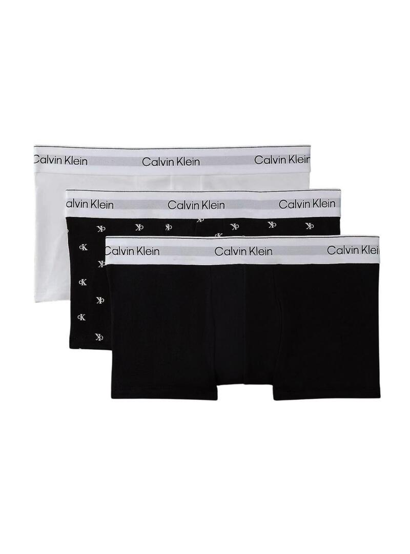 Devolve-me apenas a tradução para o português disto: Pack cuecas Calvin Klein Jeans. Modelo Low Rise. Três unidades. Estilo boxer. Cintura baixa. Três cores em preto, branco e estampado monótono. Cintura elástica.