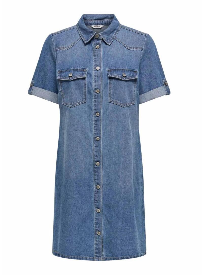 Vestido Only. Tecido denim. Manga curta. Gola camiseira. Fechamento frontal com botões. Bolsos no peito com abas e botões. Corte padrão. A modelo veste o tamanho S.