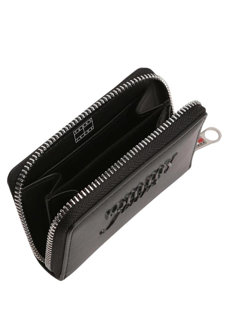 Carteira Tommy Jeans. Modelo Must small. Cor preta. Fecho com botão de pressão. Bolso com zíper para moedas. Compartimentos internos para notas e cartões. Logo da Tommy texturizado em fonte Script na parte da frente. Dimensões: 11 x 2 x 7,8 cm.