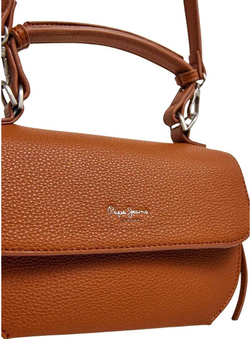 Bolsa a tiracolo Pepe Jeans. Modelo Ambra. Cor marrom. Dois compartimentos separados. Aba com fecho magnético. Alça curta do mesmo material com pega reforçada. Alça de ombro removível e ajustável. Bolso interior com fecho de correr. Detalhes decorativos de nós nas laterais. Logo estampado em letras douradas na parte da frente. Medidas de 22 x 8 x 15,5 cm.