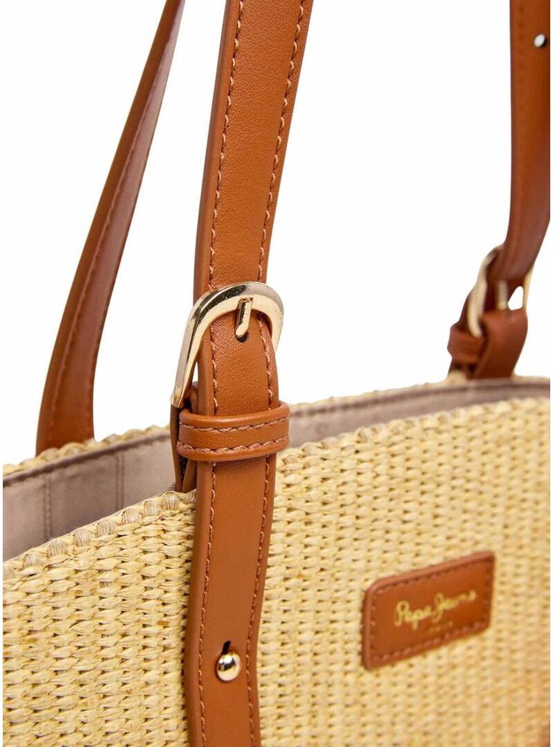 Bolsa Pepe Jeans. Modelo Trudy. Feito de ráfia. Cor natural. Alças de ombro ajustáveis ​​em marrom. Logotipo dianteiro. Formato de leque. Bolso interno com zíper.