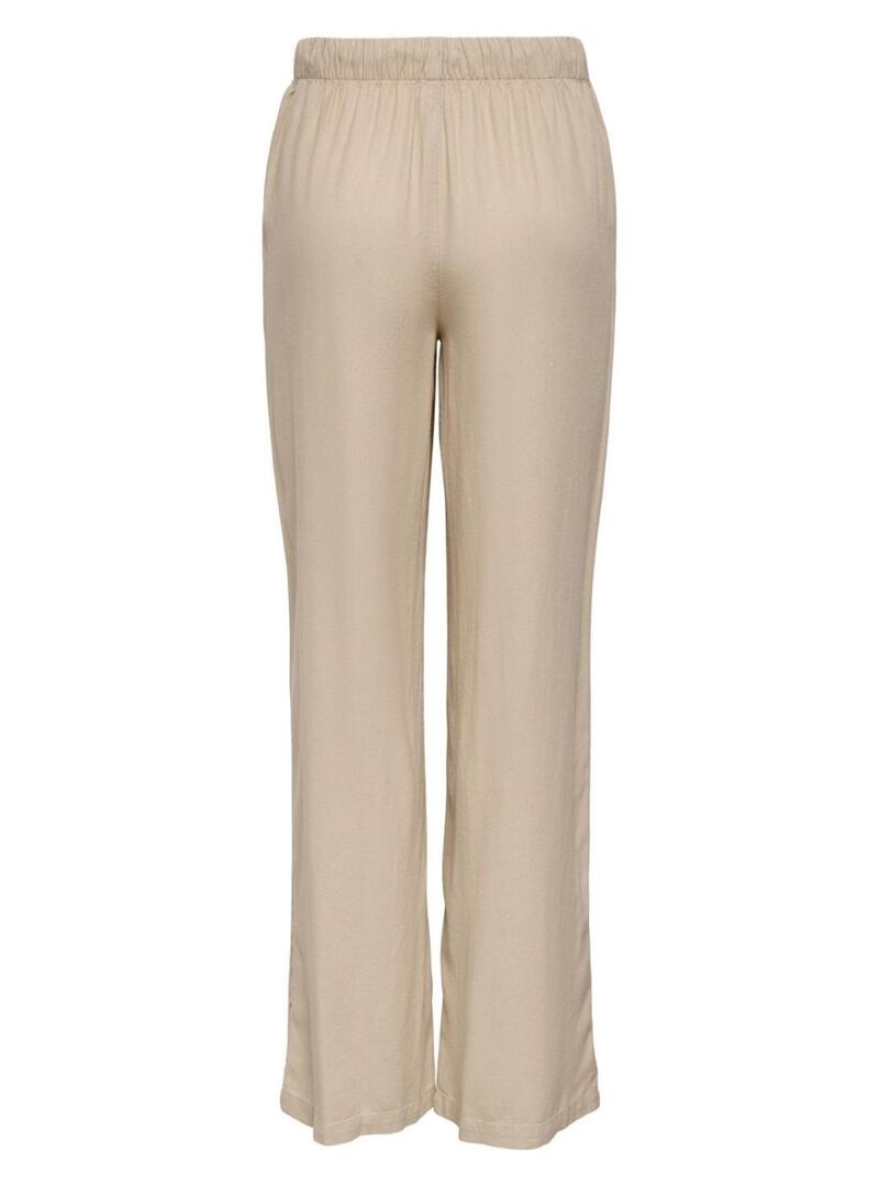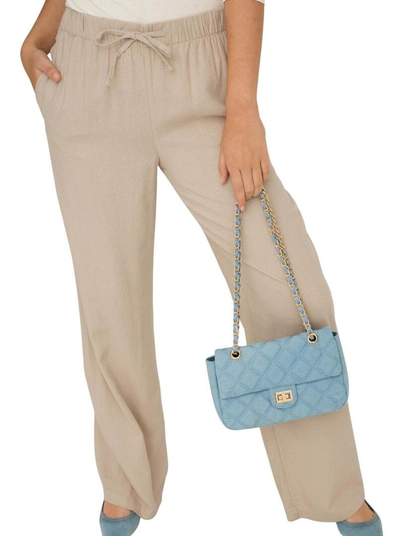 Calça Only. Modelo Goa. Cor bege. Cintura elástica ajustável com cordão. Bolsos laterais. Perna larga. Tecido fluído.
