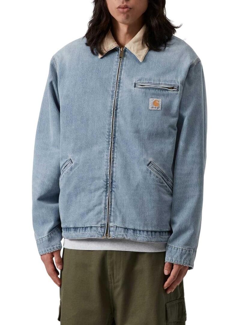 Casaco Carhartt. Modelo Detroit. Denim claro. Aparência lavada. Fecho com zíper. Gola em contraste bege. Etiqueta da marca no peito. Bolsos laterais. Bolso no peito. Corte quadrado.