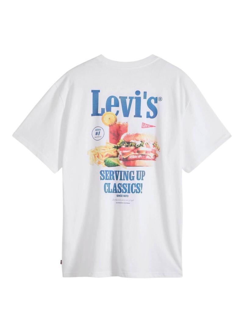 Camiseta Levis. Modelo Seving Up Classics. Cor branca. Gola redonda. Manga curta. Ajuste folgado. Etiqueta da marca na lateral. Ilustração de fast food estampada nas costas. Logo estampado no peito.