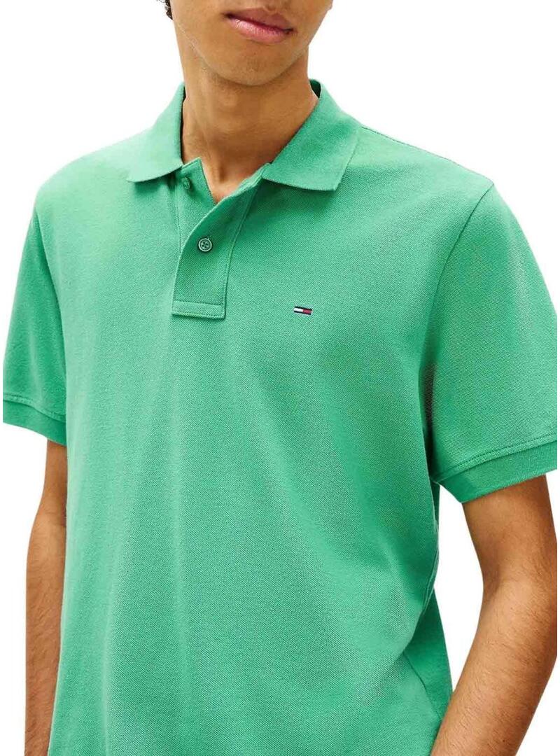 Camisa polo Tommy Jeans. Cor verde. Tecido piqué. Gola polo. Carcela com dois botões. Manga curta. Corte regular. Bandeira da Tommy bordada no peito.