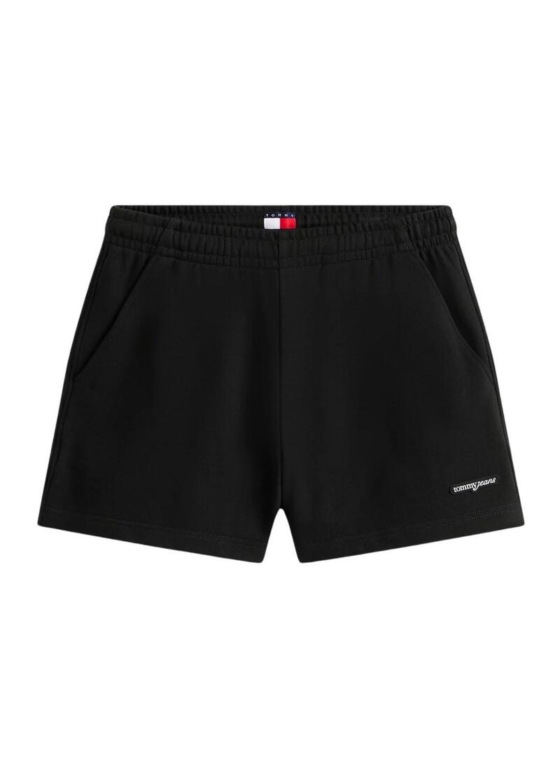 Calções Tommy Jeans. Cor preta. Cintura elástica. Bolsos laterais. Logotipo da Tommy Jeans na parte da frente. A modelo veste o tamanho S.