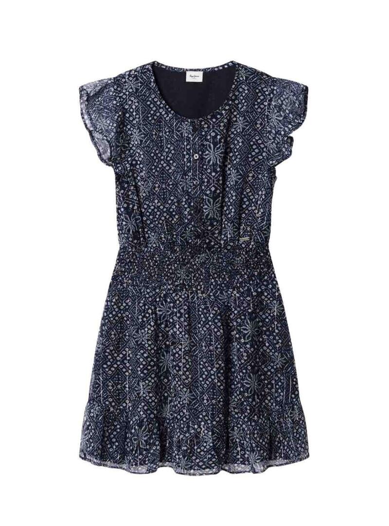 Vestido Pepe Jeans. Modelo Imabel. Cor azul marinho. Formato curto. Tecido leve de chifon. Gola redonda. Fechamento frontal com botões até a cintura. Manga curta estilo borboleta com babados. Cintura elástica com painel de favo de mel. Estampa floral em toda parte. Babados na barra. Interior com forro. Placa metálica com logotipo.