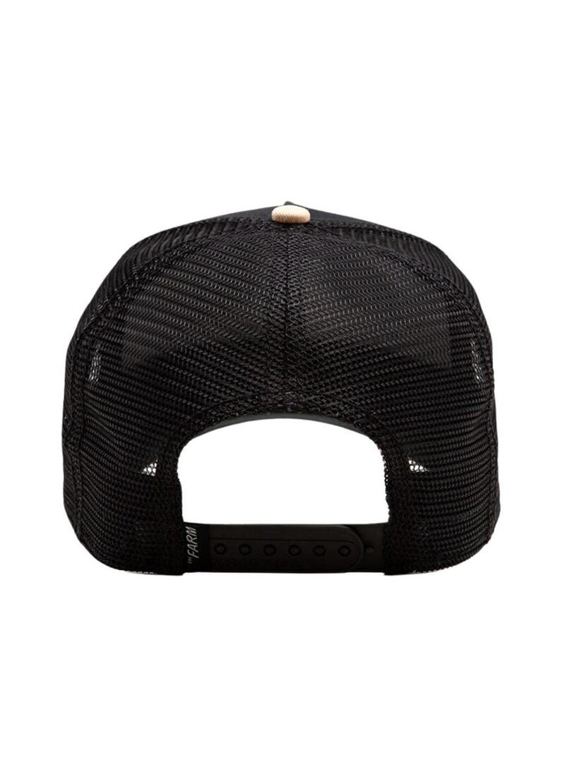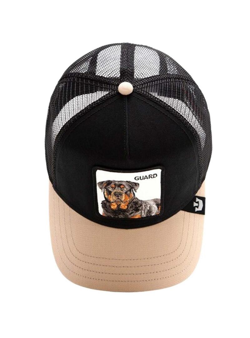 Boné Goorin Bros. Modelo The Guard Dog. Cor preta. Viseira em cor bege. Ilustração de Rotweiler estampada na frente. Parte traseira em malha. Fita traseira ajustável.