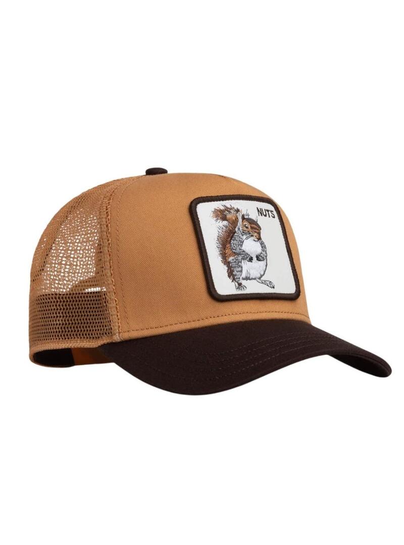 Boné Goorin Bros. Modelo Nuts. Cor tostada e marrom. Ilustração de esquilo bordada na frente. Parte de trás em malha. Fita ajustável na parte de trás.