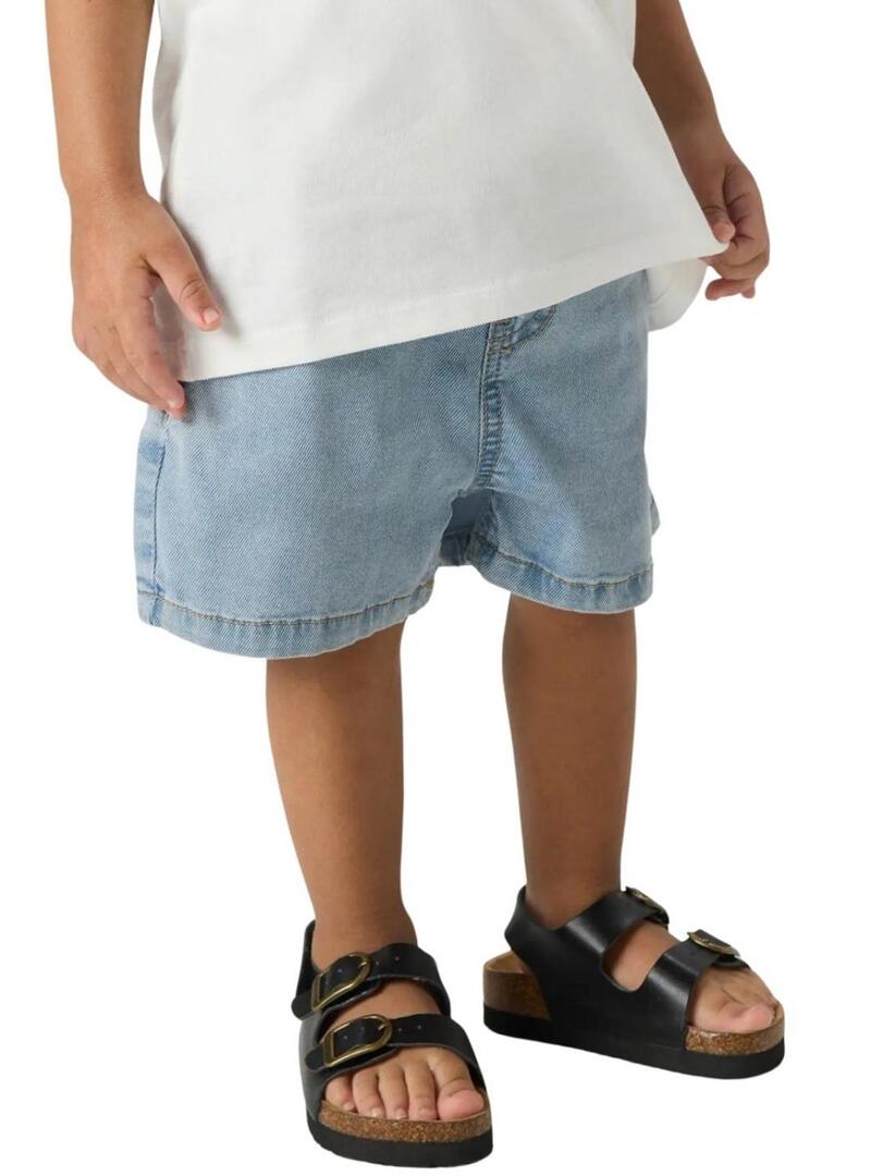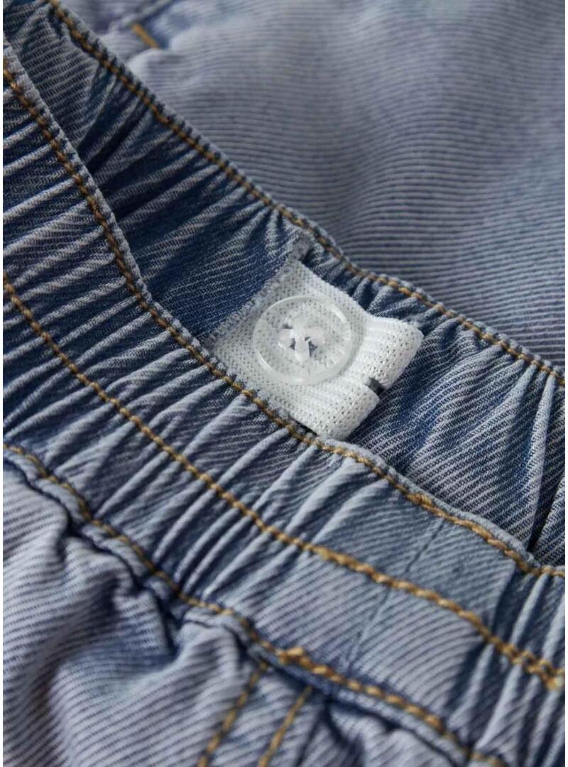 Shorts Name It. Modelo Ryan. Cor azul. Tecido de sarja. Cintura de elástico ajustável. Bolsos frontais e laterais. Corte jogger.