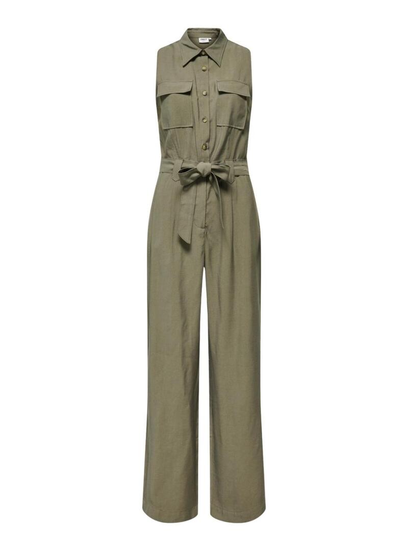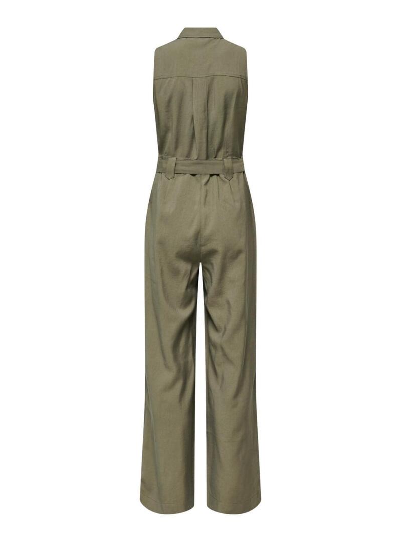 Macaco Only. Modelo Tila. Cor verde. Sem mangas. Bolsos de remendo com aba no peito. Fecho dianteiro com botões. Cinto auto-amarrado na mesma cor. Perna larga. Corte longo. Tecido leve.