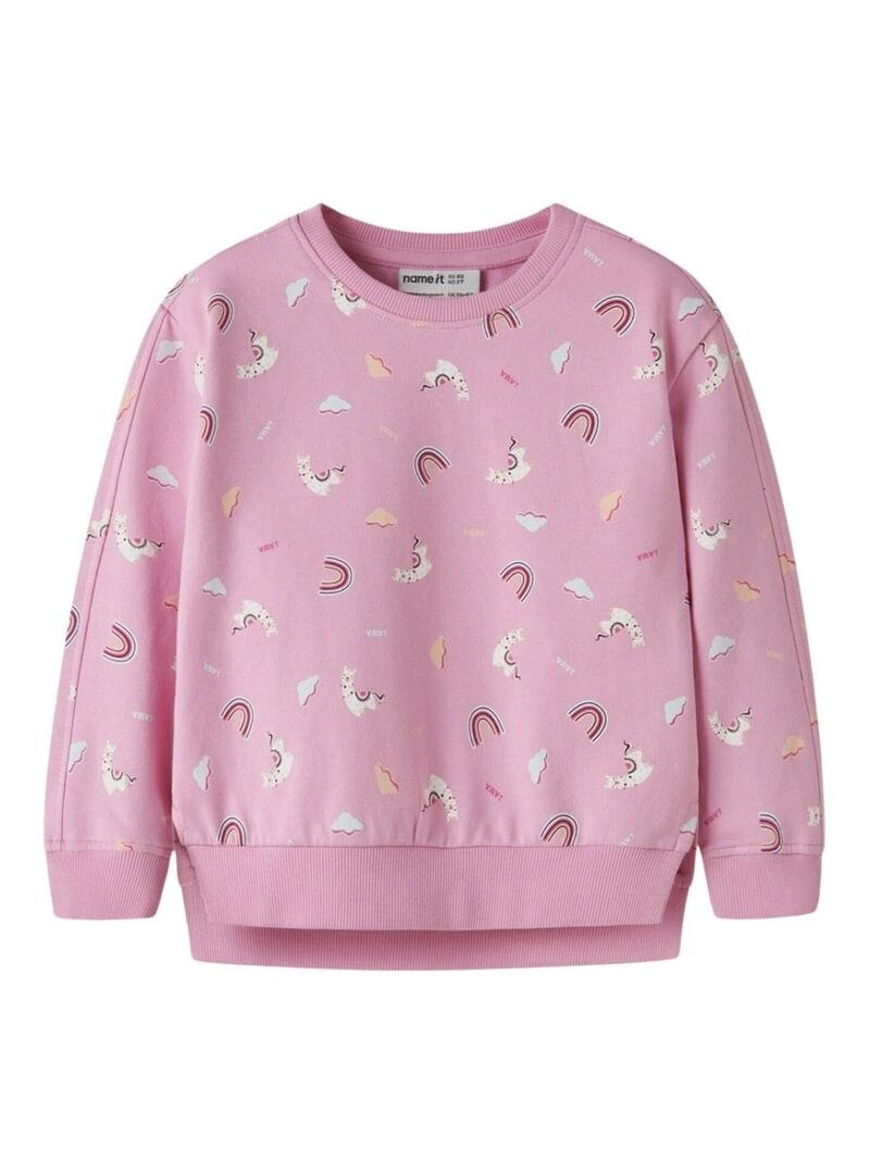 Moletom Name It. Modelo Bissine. Cor rosa. Gola redonda canelada. Estampa pigmentada por toda a peça. Corte regular. Aberturas laterais. Acabamentos canelados.