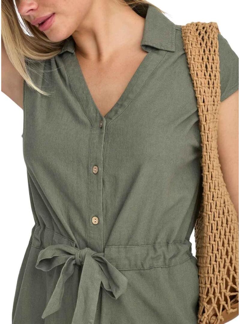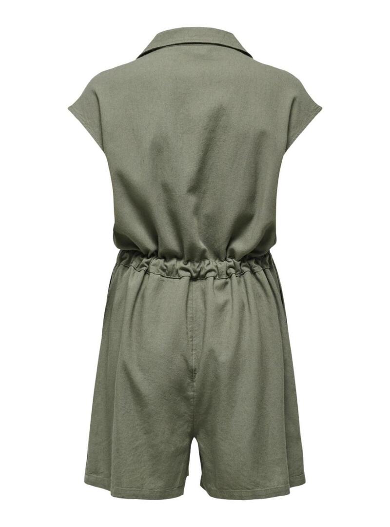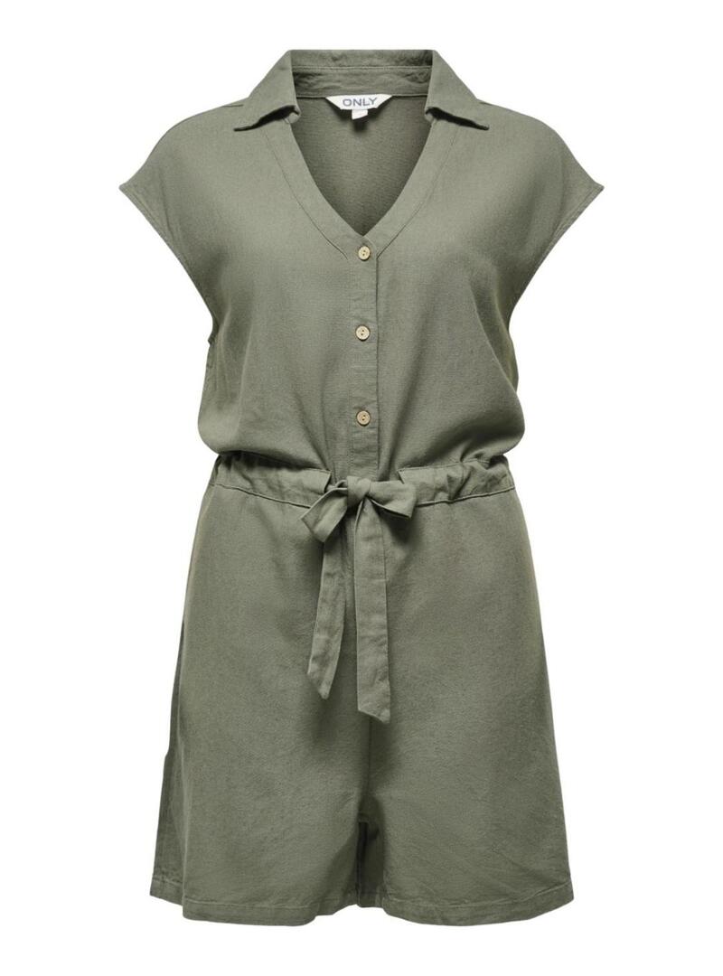 Macaco Only. Modelo Goa. Cor verde. Decote em V. Gola camiseiro. Fechamento com botões na frente. Manga curta morcego. Cinto de auto-amarrar combinando. Parte inferior estilo bermuda.