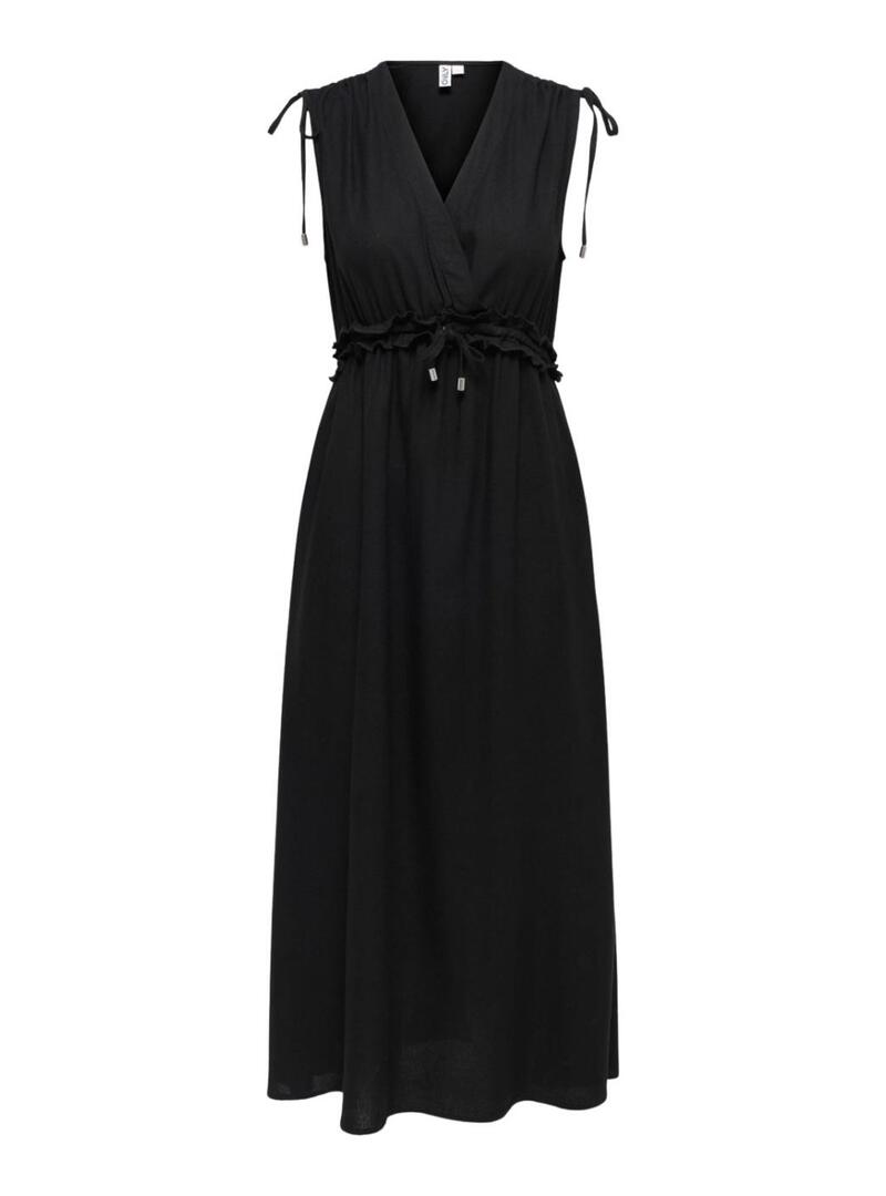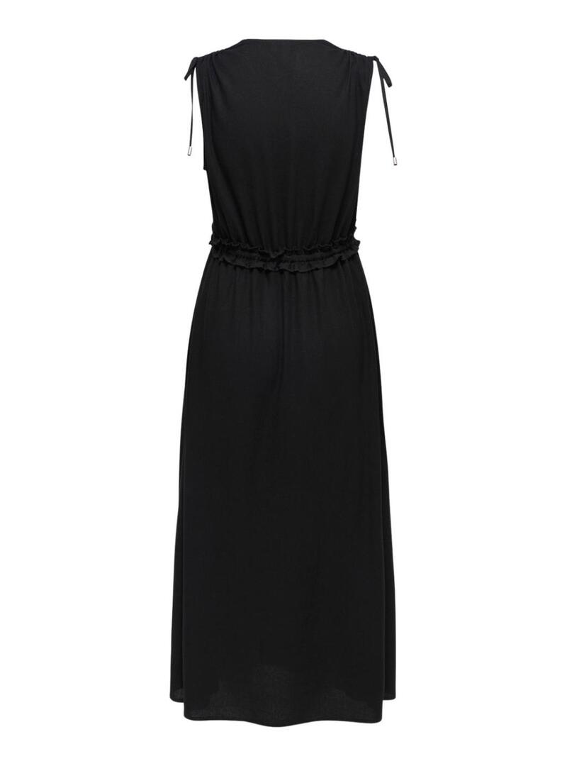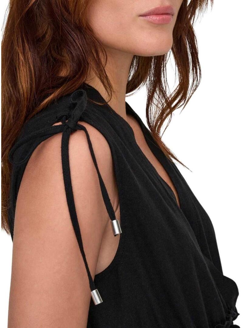 Vestido Only. Modelo Goa. Cor preta. Decote em V. Comprimento maxi. Sem mangas. Cintura ajustável com cordão. Ombros drapeados e ajustáveis com laço. Tecido fluido.