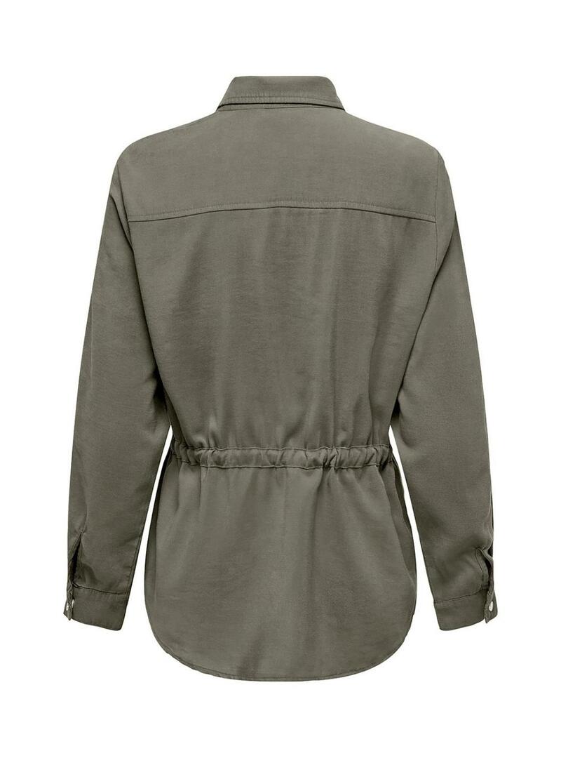 Camisa sobreposta Only. Modelo Latis. Cor verde. Fecho com botões metálicos de pressão. Gola camiseira. Bolsos de remendo no peito com aba. Cintura ajustável com cordão. Manga ajustável.