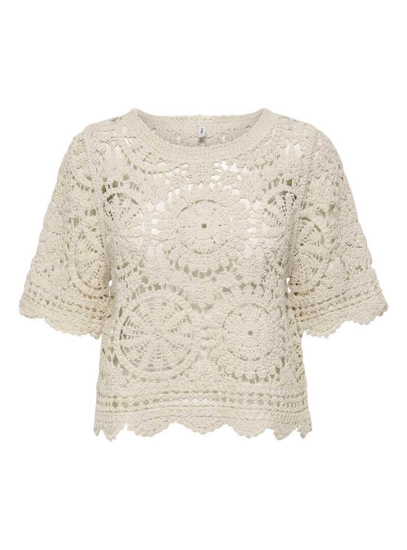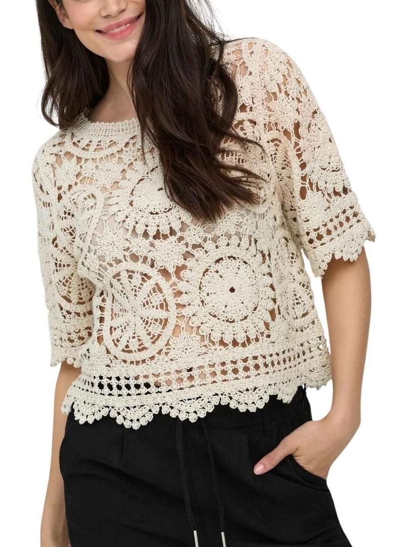 Camiseta Only. Modelo Waterly. Cor bege. Gola redonda. Manga curta. Acabamento em ondas. Tecido de crochê. Ajuste quadrado.