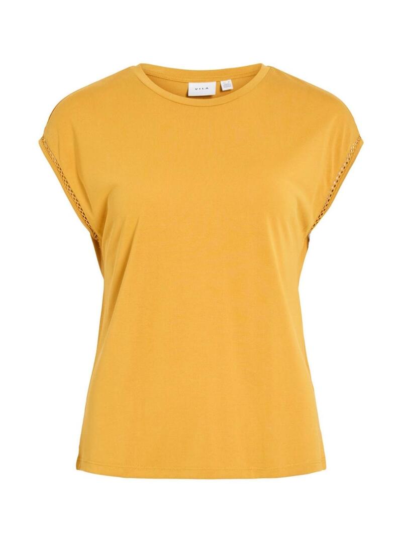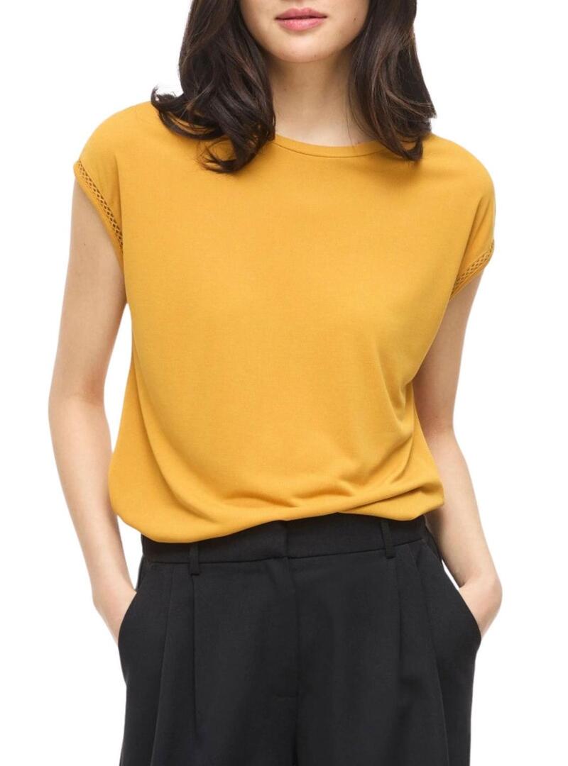 Camiseta Vila. Modelo Vimodala. Cor amarelo mostarda. Gola redonda. Manga curta morcego. Tecido leve e macio. Estilo básico.