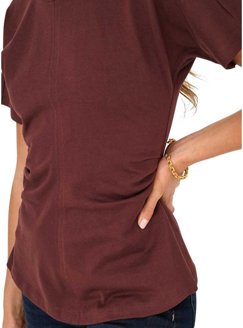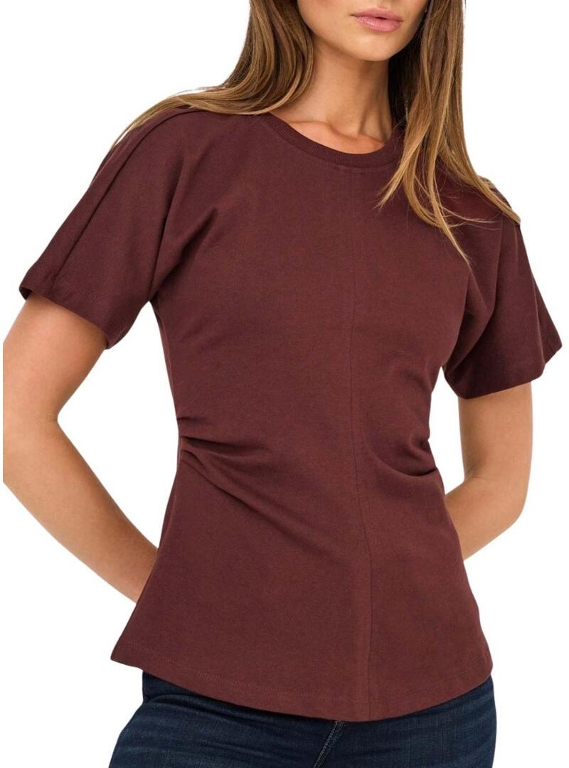 Camiseta Only. Modelo Marie. Cor granate. Costura dianteira. Franzido lateral. Manga curta. Gola redonda. Ligeiramente ajustada na cintura.