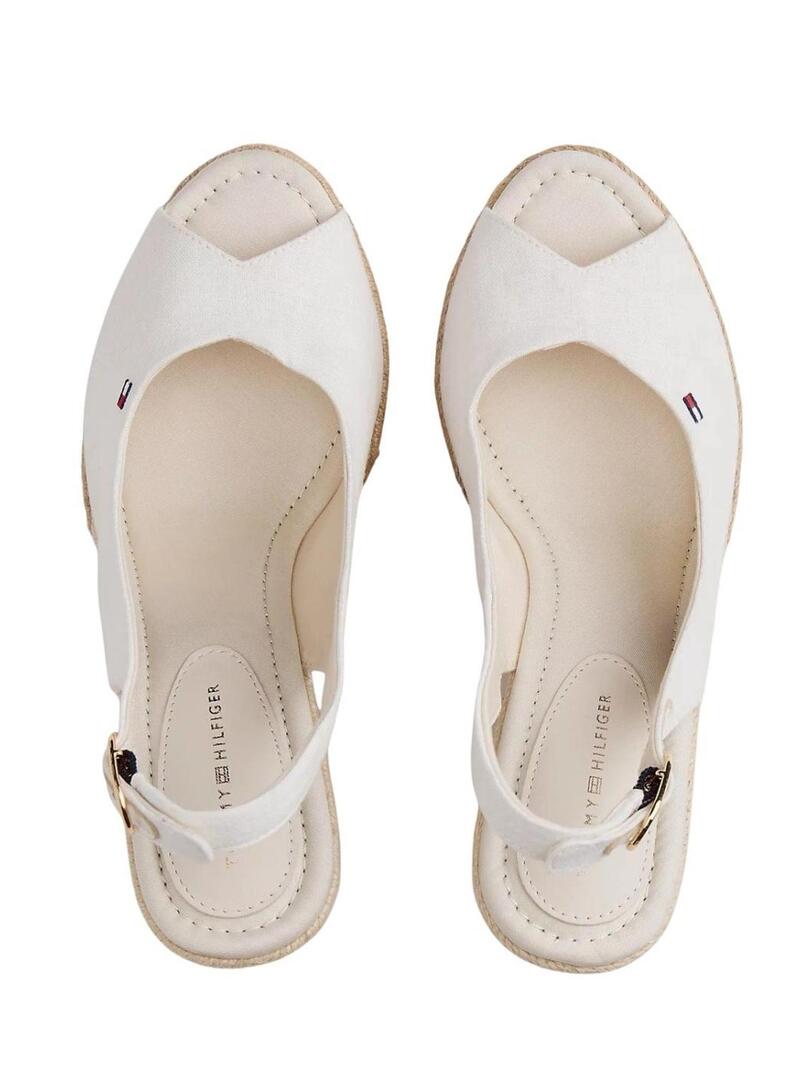 Alpercatas Tommy Hilfiger. Cor branca. Parte superior de cânhamo. Sola de borracha. Cunha de 10,2 cm. Altura da plataforma de 1,8 cm. Tira no tornozelo com fivela. Sem calcanhar. Logotipo da Tommy Hilfiger bordado na lateral. Entressola revestida com juta. Ponta aberta.