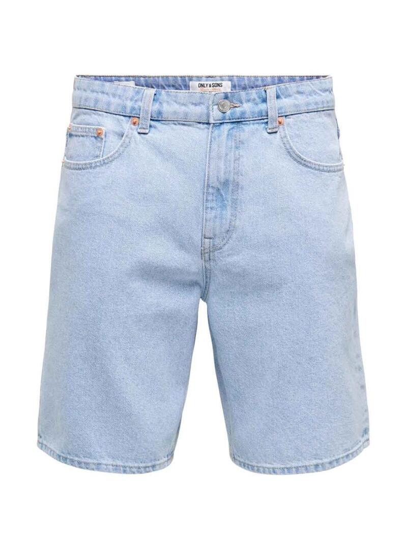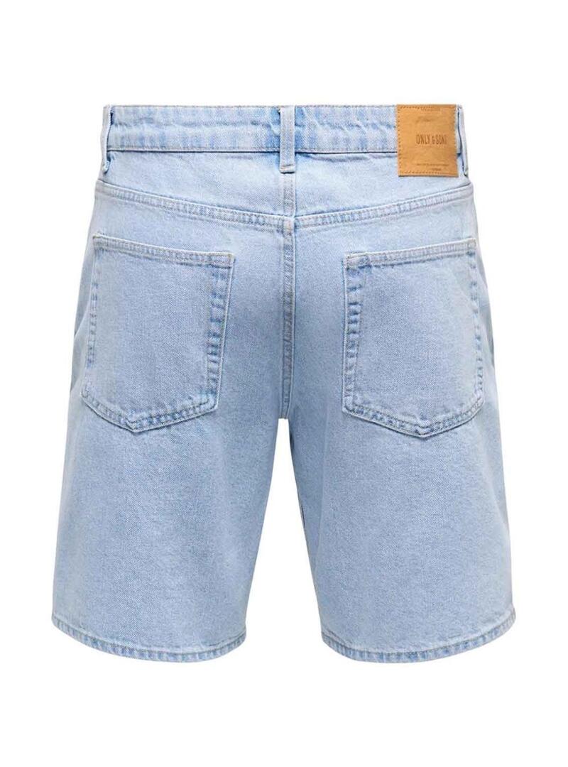 Bermudas Only and Sons. Modelo Sedge. Cor azul. Denim claro. Fecho de botão e zíper. Ajuste reto. Cinco bolsos. Remendo da marca na cintura.