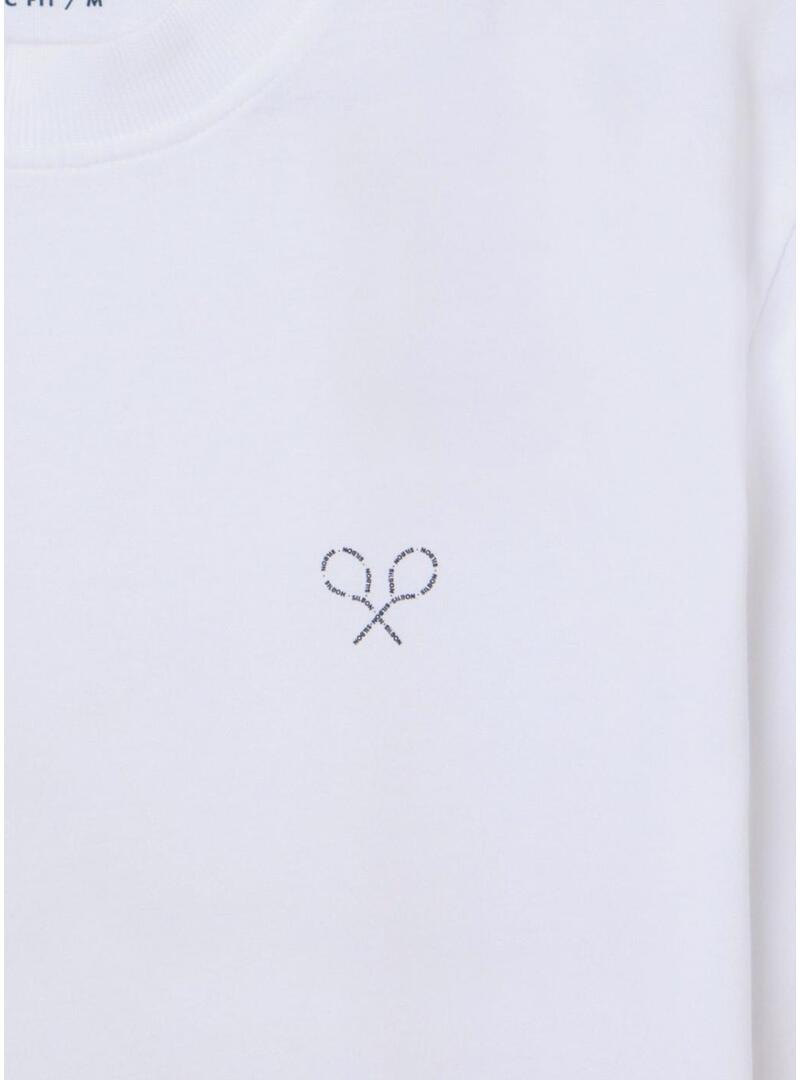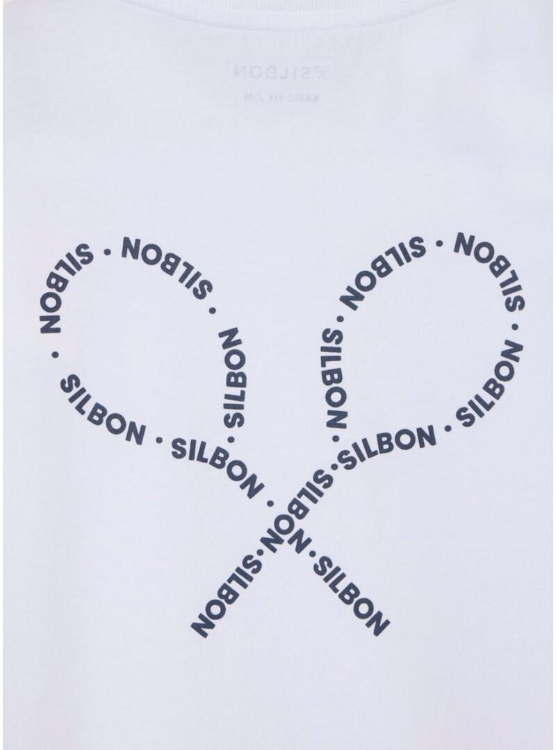Camiseta Silbon. Modelo Raquetas Lettering. Cor branca. Logotipo estampado no peito e nas costas em forma de raquetes. Manga curta. Ajuste regular. Detalhes em azul marinho.