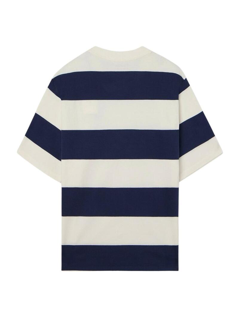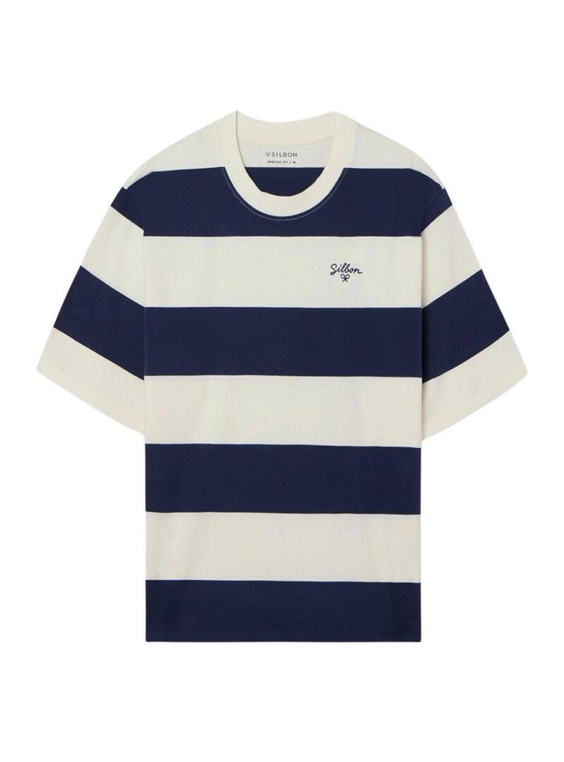Camiseta Silbon. Cor azul marinho e branco. Caimento folgado. Logotipo no peito. Estampado com listras horizontais largas. Comprimento estilo boxy, acima do quadril.