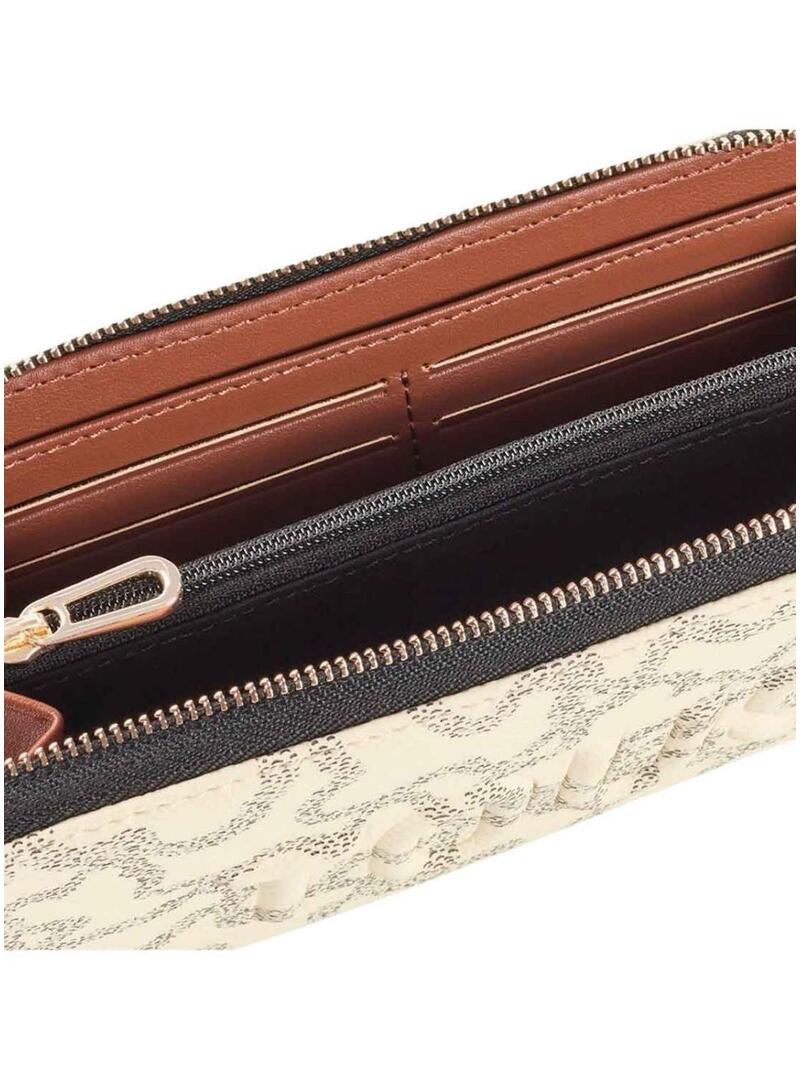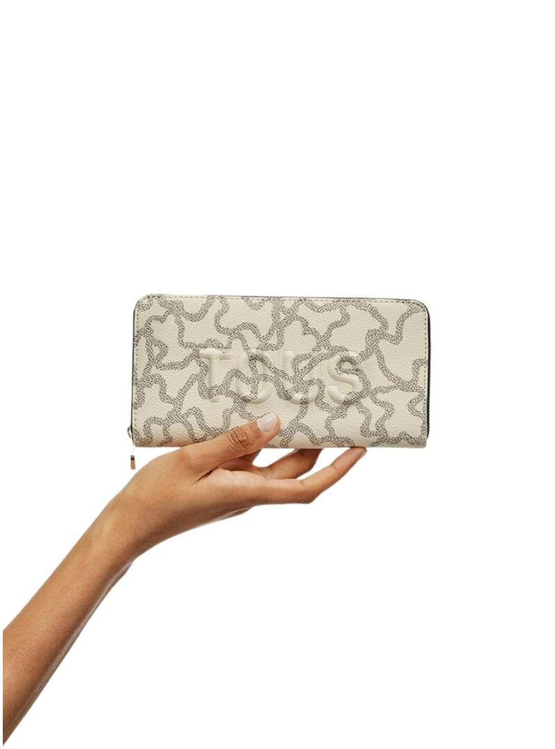 Carteira Tous. Modelo Kaos Icon. Cor bege. Estampa de ursos em cinza. Fecho de zíper. Um bolso interno com zíper para moedas. Oito slots para cartões. Quatro compartimentos abertos para notas. Medidas: 10,5 x 19,5 x 2,8 cm.