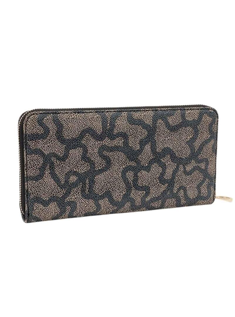 Carteira Tous. Modelo Kaos Icon. Estampa de ursos em preto. Tous em relevo na parte da frente. Fecho de zíper. Um bolso interior com zíper para moedas. Oito slots para cartões. Quatro compartimentos abertos para notas. Medidas: 10,5 x 19,5 x 2,8 cm.