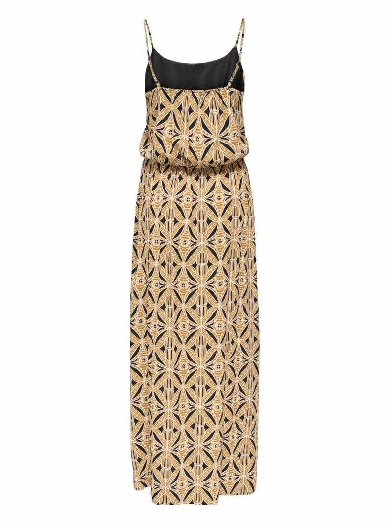 Vestido Only. Modelo Nova. Cor amarelo. Comprimento acima dos tornozelos. Estampa étnica. Cintura ajustada com elástico. Alças finas. Tecido leve.