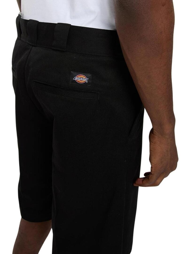Bermudas Dickies. Modelo 247. Cor preta. Fecho de botão e zíper. Comprimento até os joelhos. Bolsos laterais. Bolsos traseiros estilo chinês. Bolso lateral com etiqueta da marca. Ajuste reto.