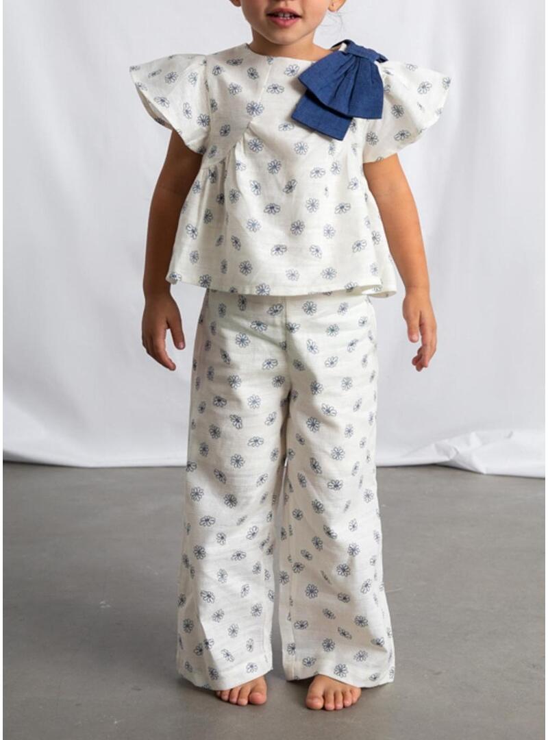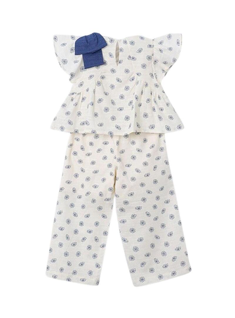 Conjunto Mayoral em cor cru com estampa floral azul. A camiseta tem gola redonda, mangas curtas com babados e um grande laço decorativo no ombro. Seu design evasê proporciona um acabamento muito doce e confortável. A calça comprida combinando completa o visual com um estilo coordenado e delicado.