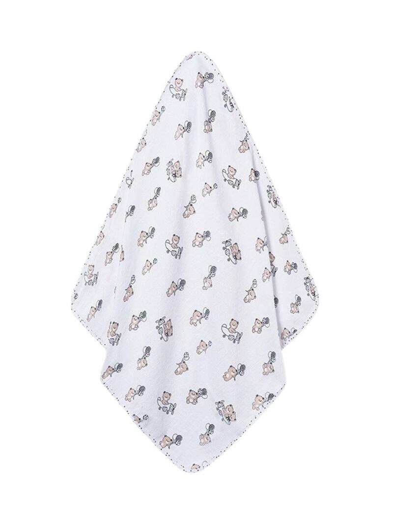 Roupão Mayoral ideal para envolver o bebê com suavidade após o banho. Confeccionado em cor branca, possui capuz com bordado de ursinhos e um delicado desenho em relevo em toda a peça.