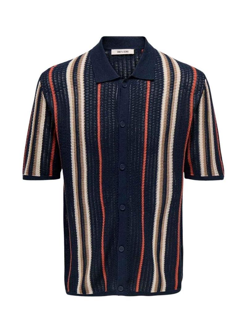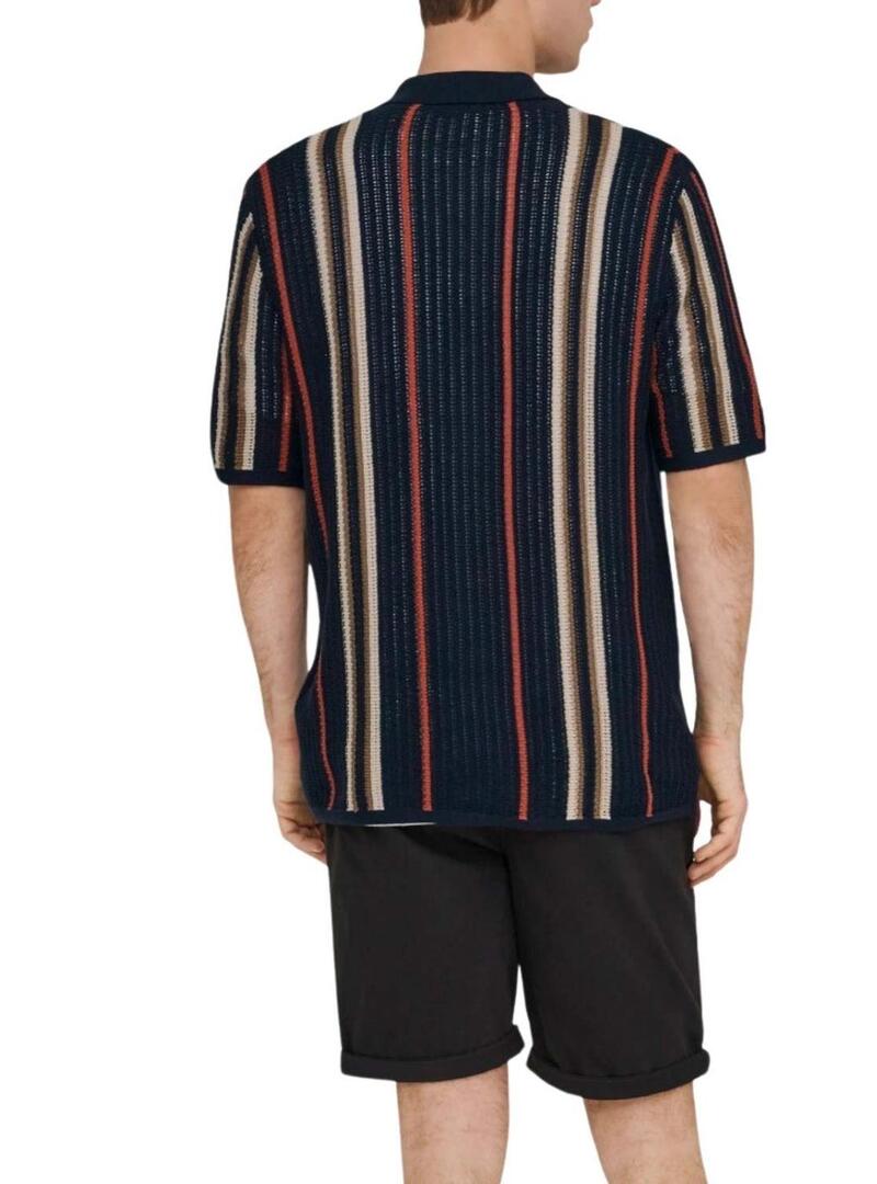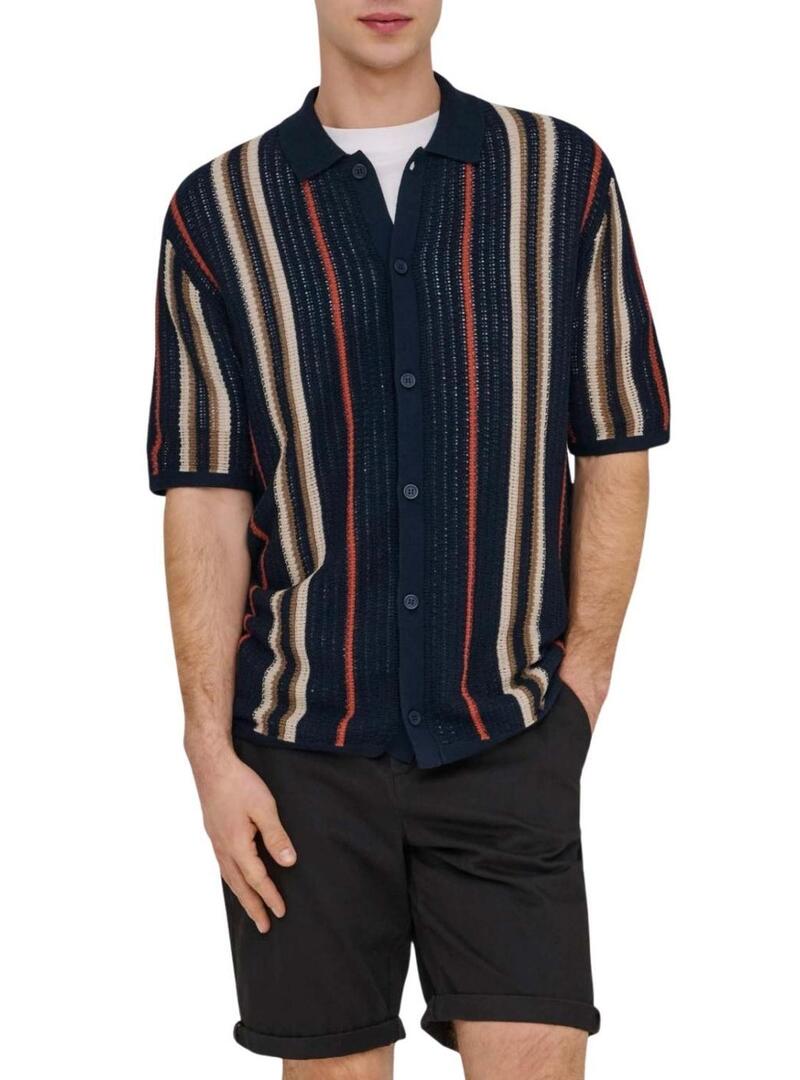Polo Only and Sons. Modelo Leon. Cor azul marinho. Estilo cardigã. Fechamento com botões frontais. Manga curta. Gola camiseiro. Ajuste folgado. Tecido de malha com listras verticais na cor.
