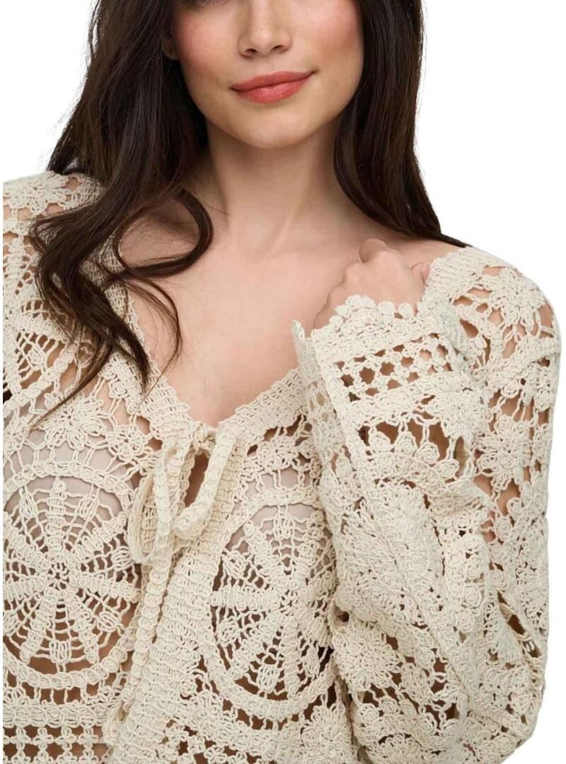 Casaco Only. Modelo Waterly. Cor bege. Tecido de crochê. Fechamento com cordões na frente. Manga comprida. Ajuste folgado.
