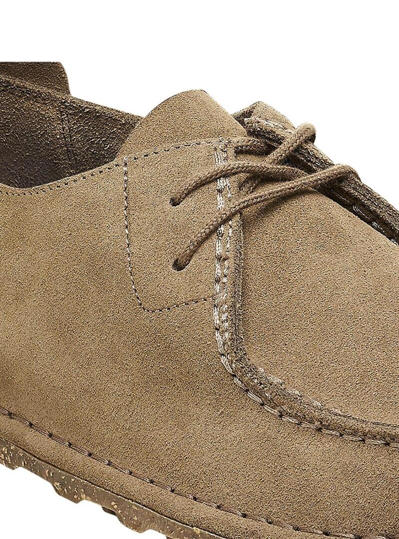 Sapatos Birkenstock. Modelo Utti Lace. Cor beige. Design atemporal estilo mocassim. Confeccionados em camurça macia. Puxador traseiro que facilita um ajuste confortável e prático. Palmilha anatômica removível Deep Blue original da BIRKENSTOCK, forrada em microfibra para maior conforto. Sola de borracha de látex com elementos de cortiça, flexível e resistente.