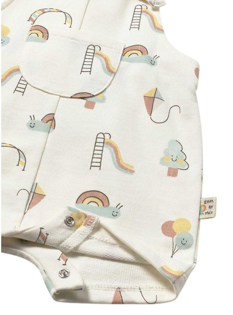 Colete curto em marfim com estampa divertida de balões, arco-íris, pipas e pequenos desenhos infantis. Seu design com alças e bolso dianteiro dá um ar doce e muito atual para os looks do bebê. É uma peça confortável e fácil de combinar com camisetas básicas ou bodies lisos no dia a dia.