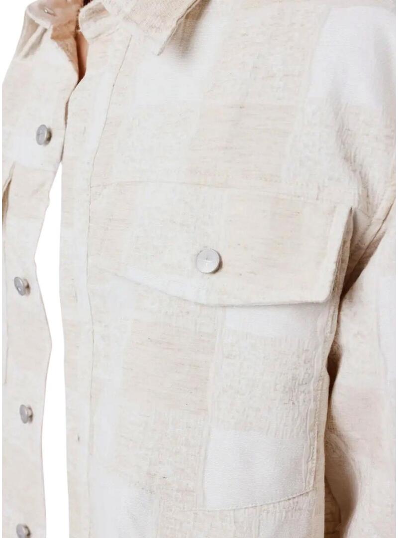 Camisa Project x Paris. Cor bege. Tecido texturizado com estampa geométrica discreta. Ajuste folgado. Corte quadrado. Manga curta. Fechamento com botões. Bolsos de remendo com aba no peito. Logo metálico na manga.