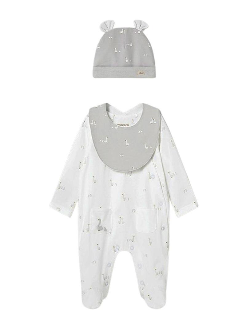 Conjunto Mayoral recém-nascido com macacão branco, babador e gorro bege para bebê.