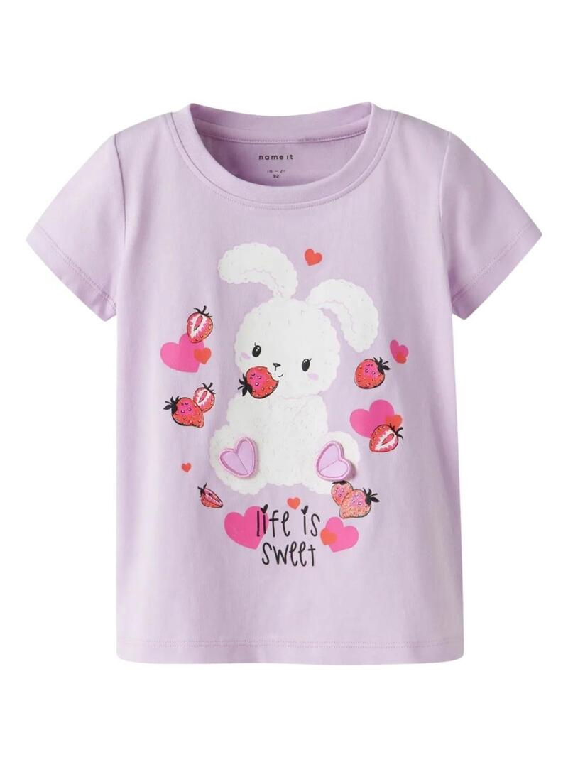 Camiseta Name It. Modelo Deppa. Cor malva. Manga curta. Gola redonda. Gráfico estampado no peito. Detalhes bordados com combinação de tecidos. Estampado com brilho. Corte regular.