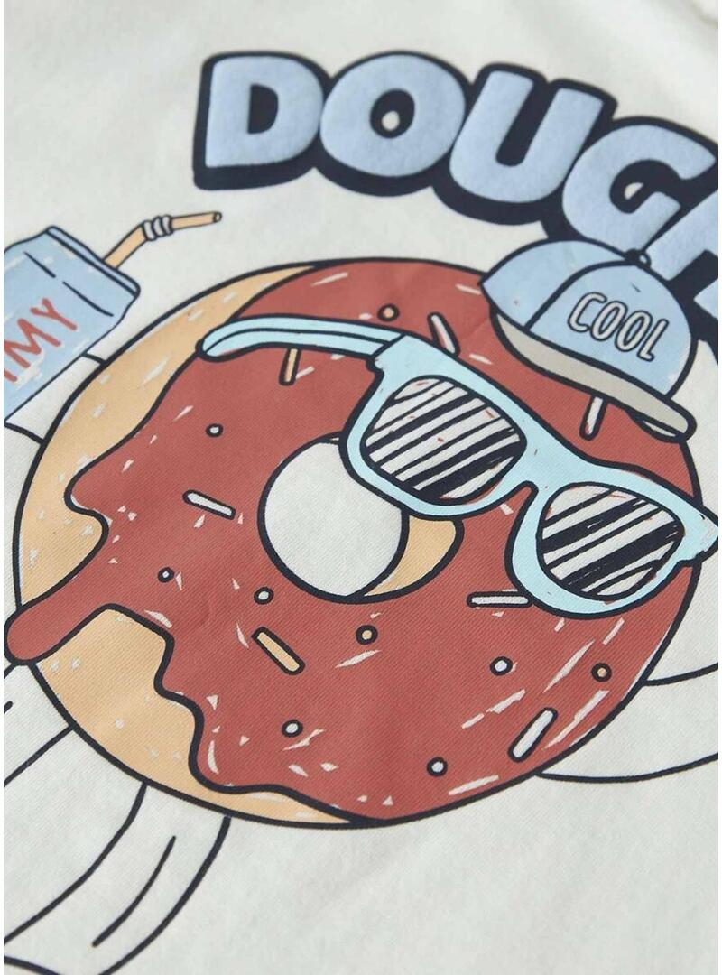 Camiseta Name It. Modelo Foxe. Cor branca. Gola redonda. Manga curta. Texto estampado no peito. Donut estampado nas costas. Formato relaxado. Ombros caídos.