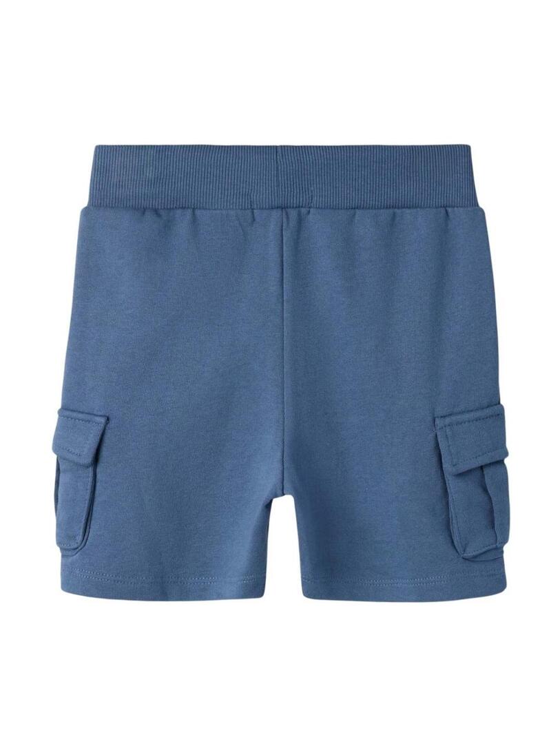 Bermudas Name It. Modelo Oli. Cor azul. Tecido macio de algodão. Cintura ajustável com cordão. Cintura de elástico. Bolsos laterais. Dois bolsos de carga. Corte regular.