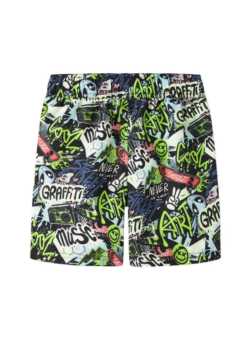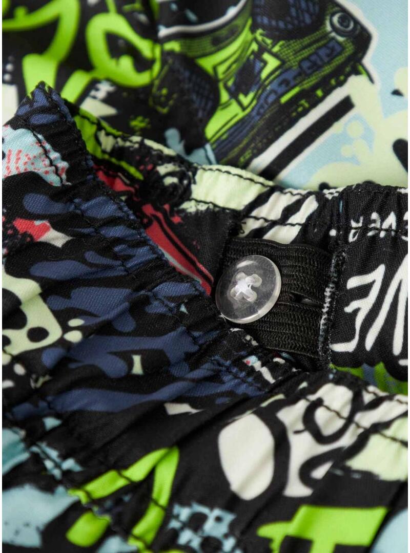 Fato de banho Name It. Cor preta. Estampa de grafite. Cintura de elástico ajustável com cordões. Bolsos laterais.