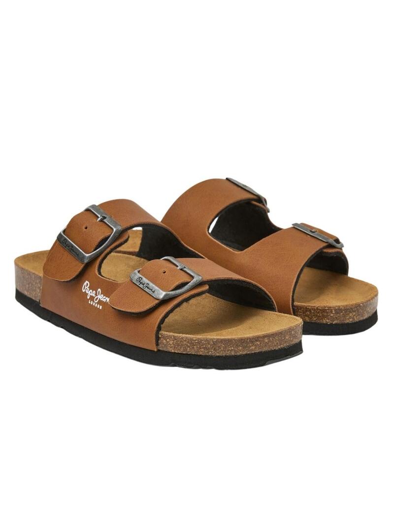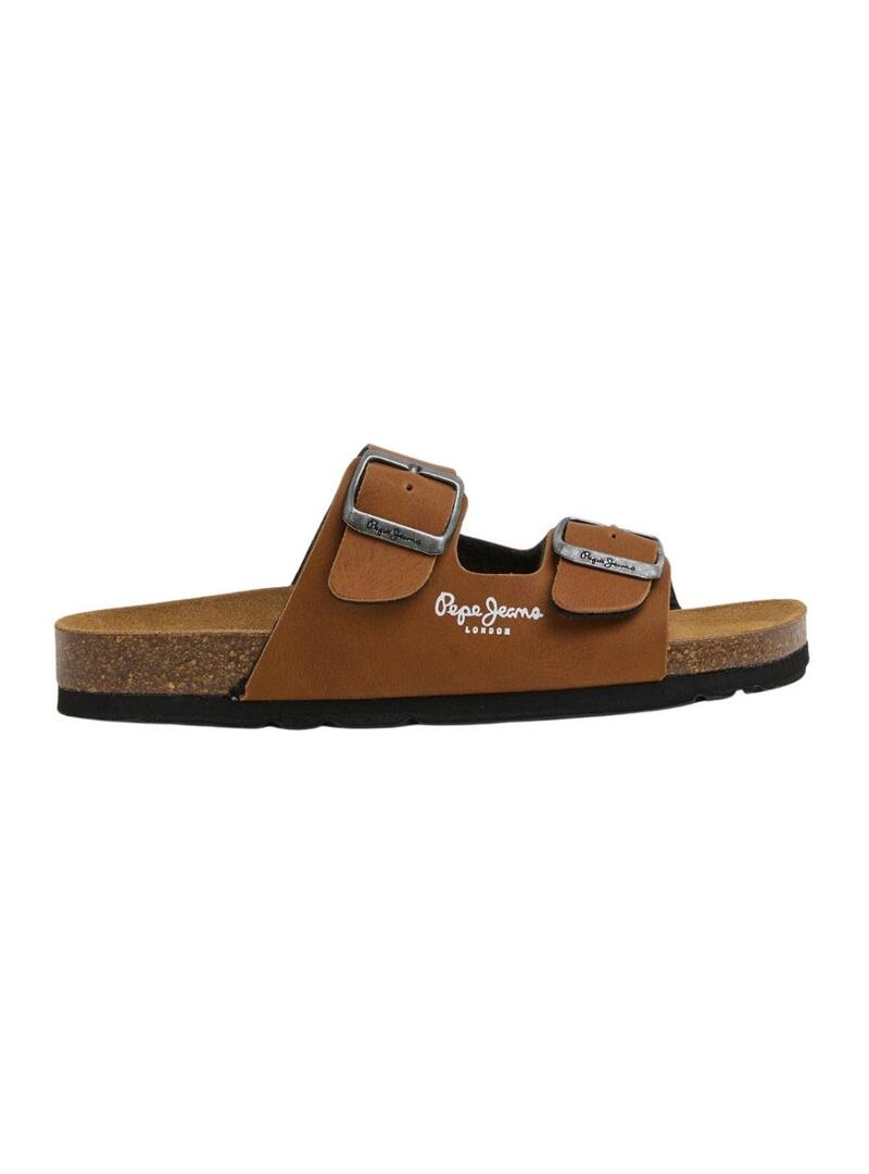 Sandalia Pepe Jeans. Anatômica. Em cortiça natural. Cor marrom. Parte superior com fivela dupla. Logotipo no lado e na palmilha. Feita na Espanha.