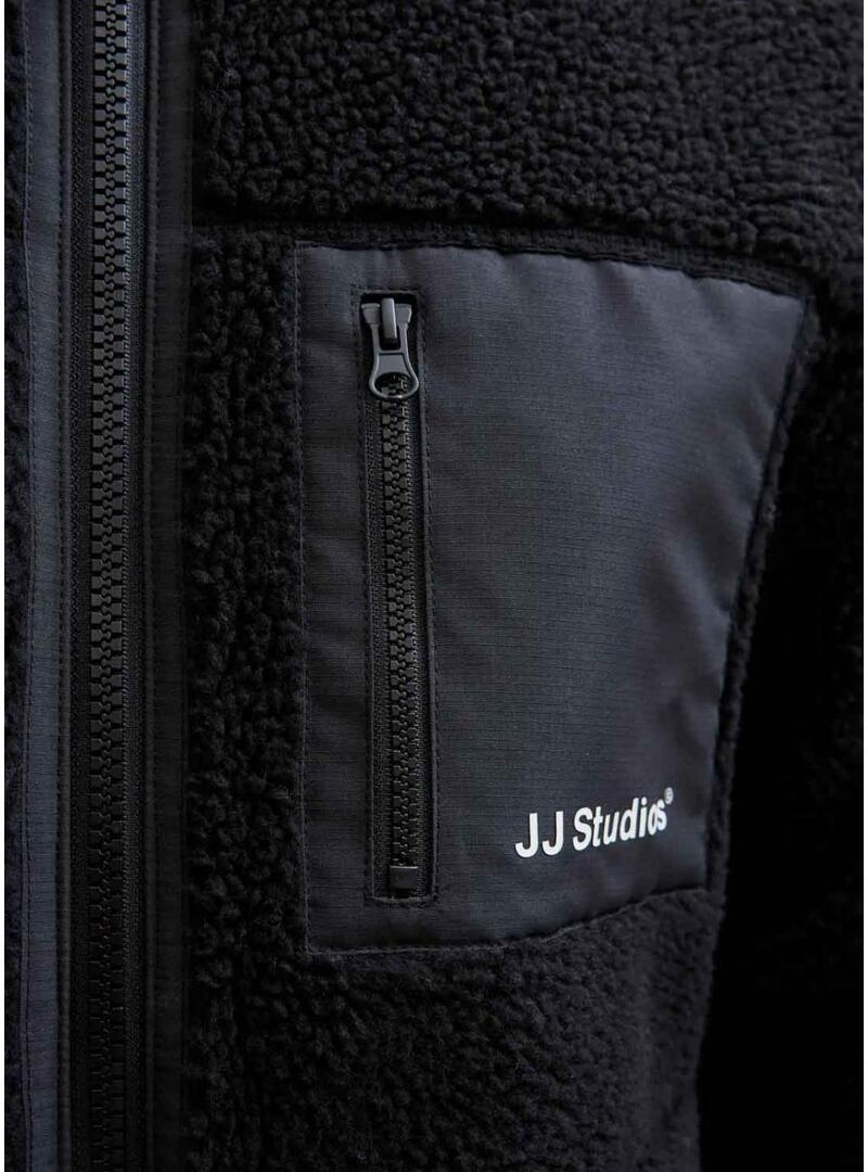 Casaco Jack and Jones. Modelo Soho. Cor preta. Tecido de carneiro macio. Gola alta. Fecho com zíper. Bolso no peito. Detalhes em tecido de contraste. Ajuste regular. Bolsos laterais. Logo JJ Studios estampado no peito.