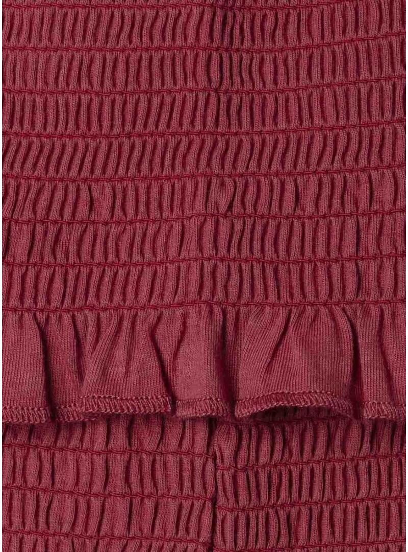 Top Pepe Jeans. Modelo Georgina. Cor granada. Tecido franzido. Ombros descobertos. Manga curta. Babados nas mangas e na barra. Placa de metal com o logo da Pepe Jeans.