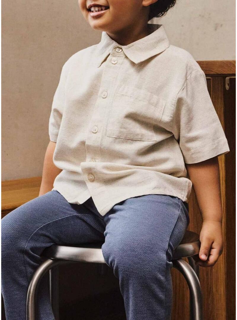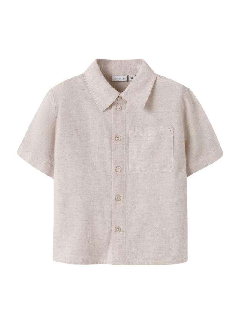 Camisa Name It. Cor creme. Manga curta. Fecho frontal com botões. Bolso no peito. Corte regular. Tecido com linho.