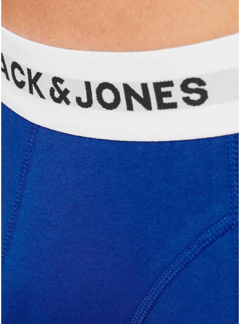 Pack de cuecas Jack and Jones. Modelo Joe. Três unidades. Estilo boxer. Banda elástica na cintura com logo. Cor azul Klein, cinza e azul marinho.