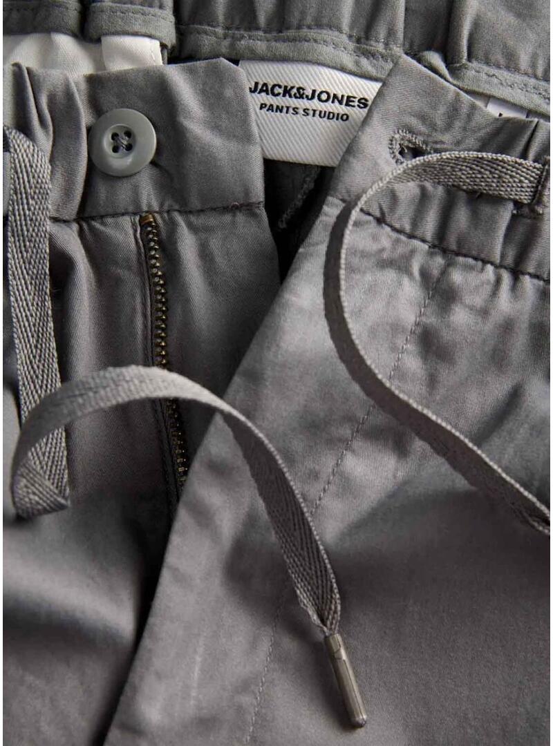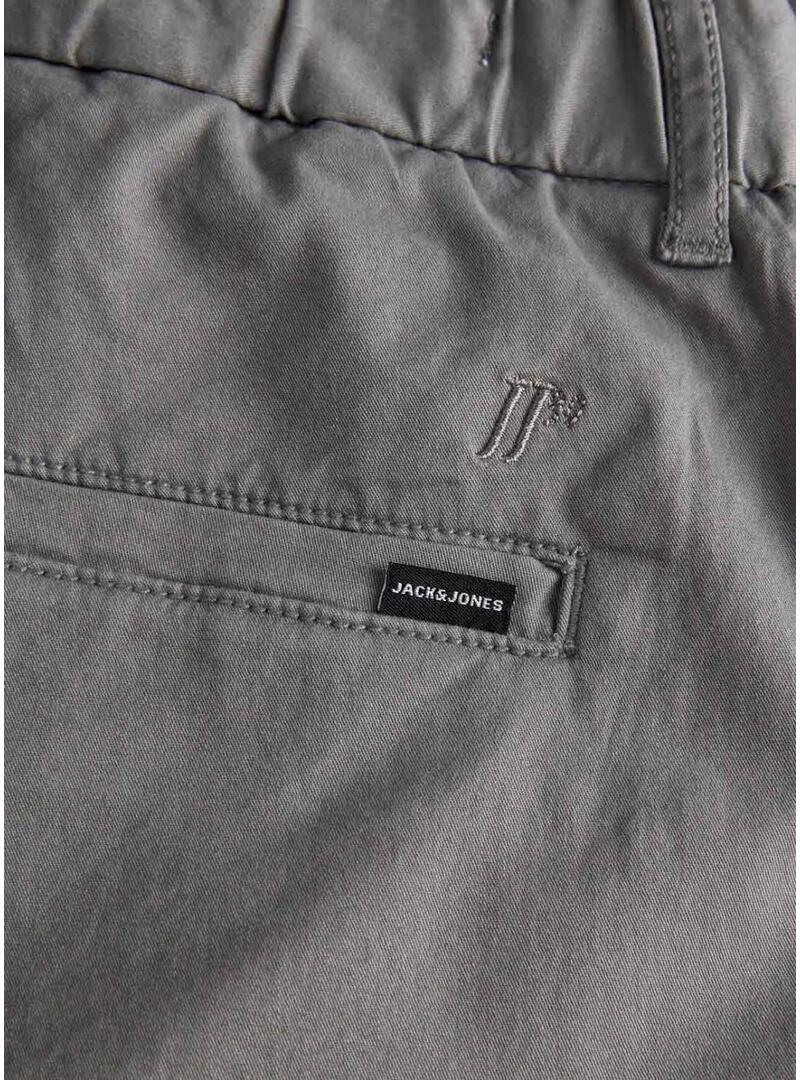 Calça Jack and Jones. Modelo Kane Rocco. Cor cinza. Cintura elástica com cordão. Fecho de botão e zíper. Estilo chinês. Bolsos laterais. Corte reto.