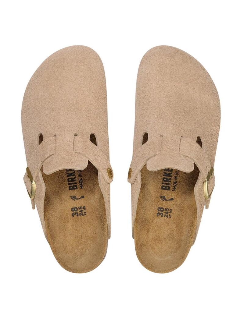 Tamancos Birkenstock. Modelo Boston. Cor bege. Design clássico de tamancos, versátil para usar durante todo o ano. Fabricados em camurça muito macia, com acabamento natural que se adapta ao pé como uma segunda pele. Possuem palmilha anatômica de cortiça-látex revestida em camurça, que proporciona conforto e suporte. Sola de EVA leve e flexível. Detalhe de correia ajustável com fivela metálica para um ajuste personalizado.